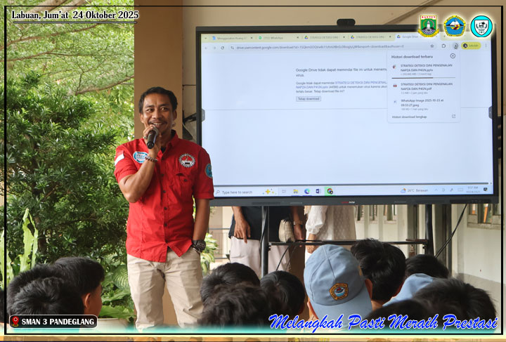 Kegiatan di atas panggung Sasana Krida dibuka langsung oleh Plt. Kepala Sekolah SMAN 3 Pandeglang, Ibu Aan Qona’ah. Dalam sambutannya, beliau menyampaikan bahwa kegiatan ini merupakan bentuk kepedulian dan kekhawatiran pihak sekolah terhadap generasi muda, khususnya para siswa yang sedang tumbuh di tengah tantangan besar zaman sekarang.